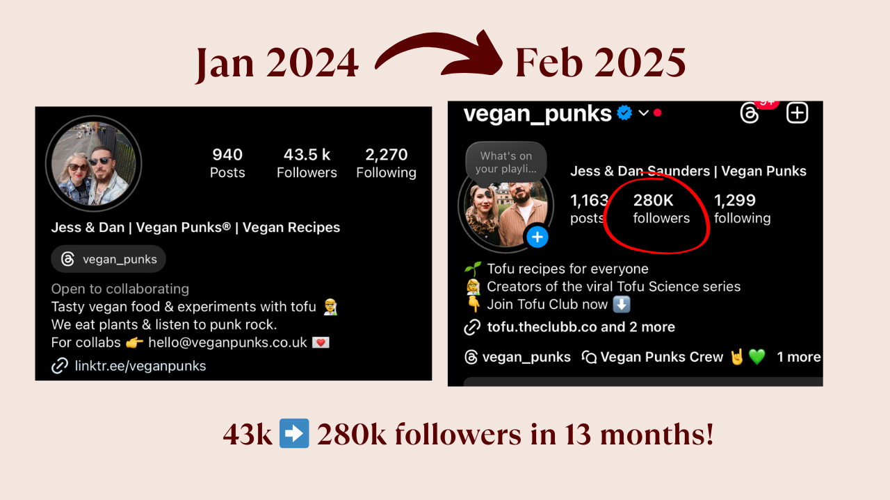 In the past year, we’ve grown our food page @vegan_punks from 40K to 280K followers and helped numerous food bloggers do the same.